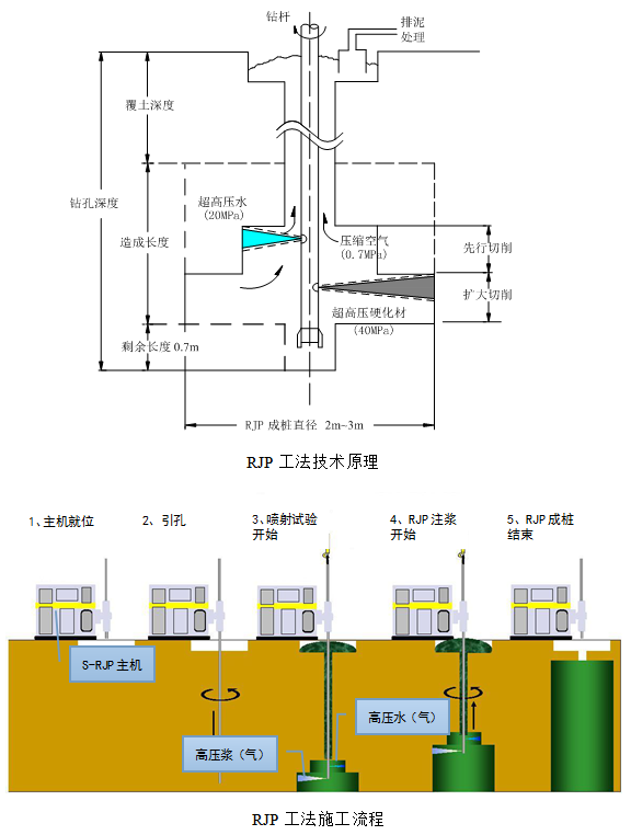 RJP(Rodin Jet Pile)工法是利用超高壓噴流體所具有的動能將土層的組織結(jié)構(gòu)破壞,混合攪拌這些被破壞的土顆粒和硬化材料,從而形成大口徑的改良體。RJP工法對土體進行兩次切削破壞,第一次是利用上段超高壓水與壓縮空氣復(fù)合噴射流體先行切削土體;第二次是利用下段超高壓漿液與壓縮空氣復(fù)合噴射流體擴大切削土體,從而形成大直徑的樁體。